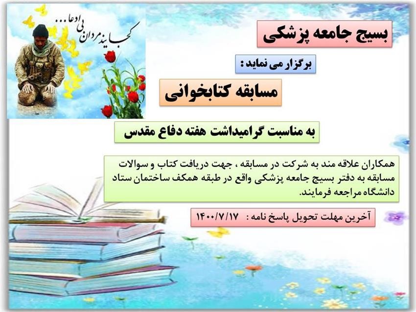 اطلاعیه برگزاری مسابقه کتابخوانی به مناسبت گرامیداشت هفته دفاع مقدس ۲۹ شهریور ۱۴۰۰ | ۱۱:۲۴ کد : ۲۰۲۹۴ اطلاعیه ارسال به دیگران نام شما ایمیل شما ایمیل دریافتکننده ارسال انصراف تعداد بازدید:۲۶۷۰۶