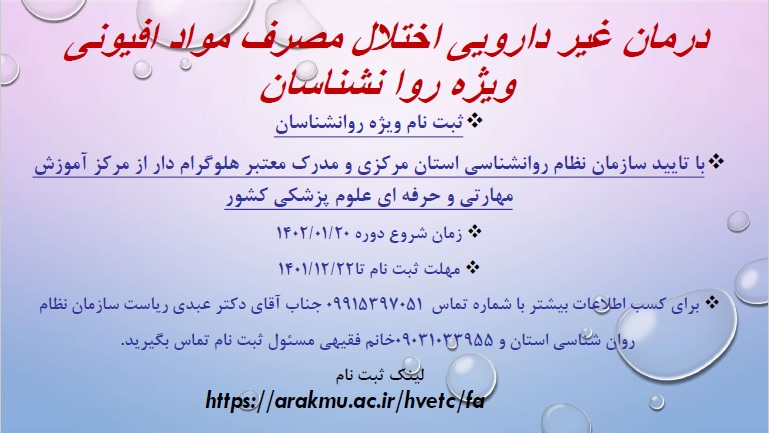 برگزاری دوره آموزشی و مهارتی اختلال مصرف مواد افیونی ویژه روان شناسان ۱۵ اسفند ۱۴۰۱ | ۰۸:۴۰ کد : ۳۲۸۶۷ اطلاعیه ارسال به دیگران نام شما ایمیل شما ایمیل دریافتکننده ارسال انصراف تعداد بازدید:۲۰۰۱۲ لینک ثبت نام