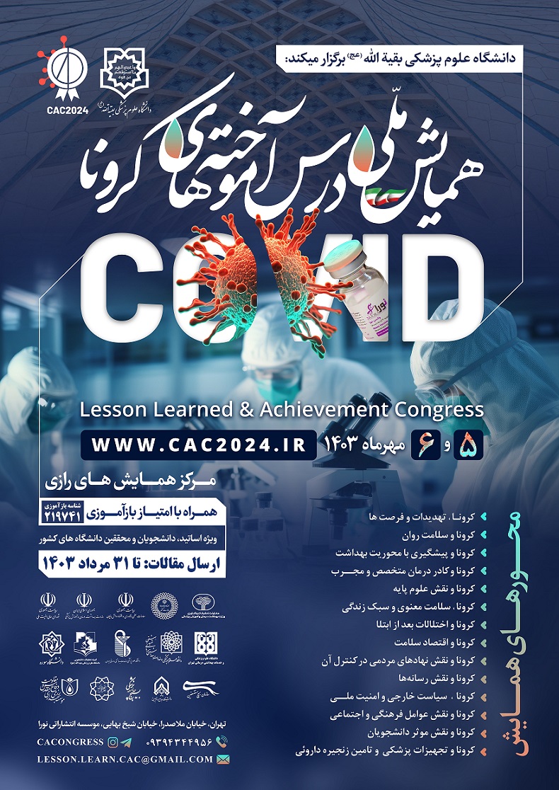 همایش ملی درس آموخته های کرونا در تاریخ ۵ و ۶ مهرماه ۱۴۰۳ در سالن همایش های رازی تهران ، توسط دانشگاه علوم پزشکی بقیه الله(عج) ، برگزار خواهد شد. این همایش ضمن ارائه و نشر تجربیات و درس آموخته های ارزشمند اساتید ، محققین و دانشجویان در حوزه کرونا در قالب مقالات و برگزاری پنل ها و سخنرانی ها، نسبت به اجرای جشنواره فرهنگی و هنری با ارائه آثار (عکس، نقاشی، فیلم مستند، شعر ، موسیقی و ...) ، رویداد ایده و فن بازار مرتبط به بیماری کرونا، اقدام خواهد نمود.
