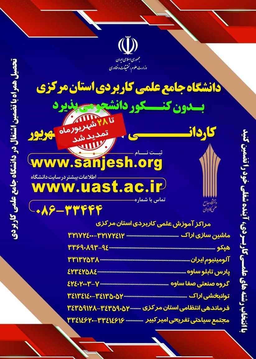 بر اساس اطلاع رسانی دانشگاه جامع علمی کاربردی ، برنامه ریزی صورت پذیرفته به منظور فراهم نمودن تسهیلات بیشتر برای آن دسته از داوطلبانی که از ۱۹ شهریور ماه تاکنون برای ثبت نام و انتخاب رشته در دوره های کاردانی این دانشگاه اقدام نکرده اند ترتیبی اتخاذ شده است که بتوانند تا ۲۸ شهریورماه با مراجعه به پرتال اطلاع رسانی سازمان ملی سنجش و ارزشیابی نظام آموزش کشور به نشانی ww.sanjesh.org و همچنین پرتال اطلاع رسانی دانشگاه جامع علمی کاربردی استان مرکزی به نشانی mk.uast.ac.ir پس از مطالعه دفترچه راهنمای پذیرش نسبت به ثبت نام و انتخاب رشته خود اقدام کنند.