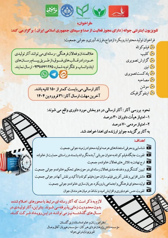 فراخوان دفتر امور زنان و خانواده استانداری گلستان با عنوان " تلویزیون اینترنتی جوانه " پیرامون تولید محتوا با رویکرد ازدواج ، فرزندآوری و جوانی جمعیت به پیوست می باشد.