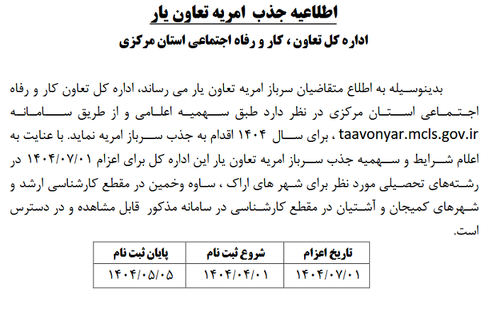 اطلاعیه جذب امریه تعاون یار ۱۱ تیر ۱۴۰۴ | ۱۲:۰۴ کد : ۵۲۷۴۸ اطلاعیه ارسال به دیگران نام شما ایمیل شما ایمیل دریافتکننده ارسال انصراف تعداد بازدید:۱۰۳۱ اطلاعیه جذب امریه تعاون یار