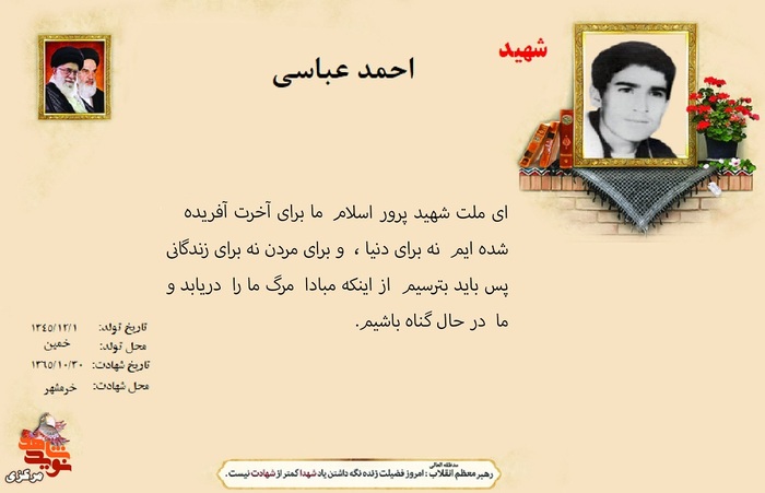 فرازی از وصیت نامه شهدا ۱۳ دی ۱۴۰۴ | ۱۰:۰۱ کد : ۵۷۴۶۹ اطلاعیه ارسال به دیگران نام شما ایمیل شما ایمیل دریافتکننده ارسال انصراف تعداد بازدید:۴۵۴ فرازی از وصیت نامه شهدا فرازی از وصیت نامه شهید بزرگوار احمد عباسی :