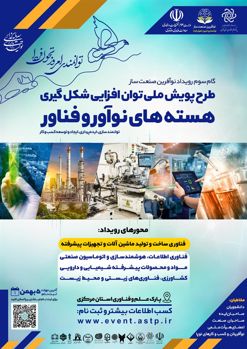 به اطلاع می رساند با توجه به تفاهم نامه دانشگاه علوم پزشکی اراک با پارک علم و فناوری استان مرکزی ، سومین گام طرح پویش ملی نوآفرین «صنعتساز» استان مرکزی برگزار می گردد.