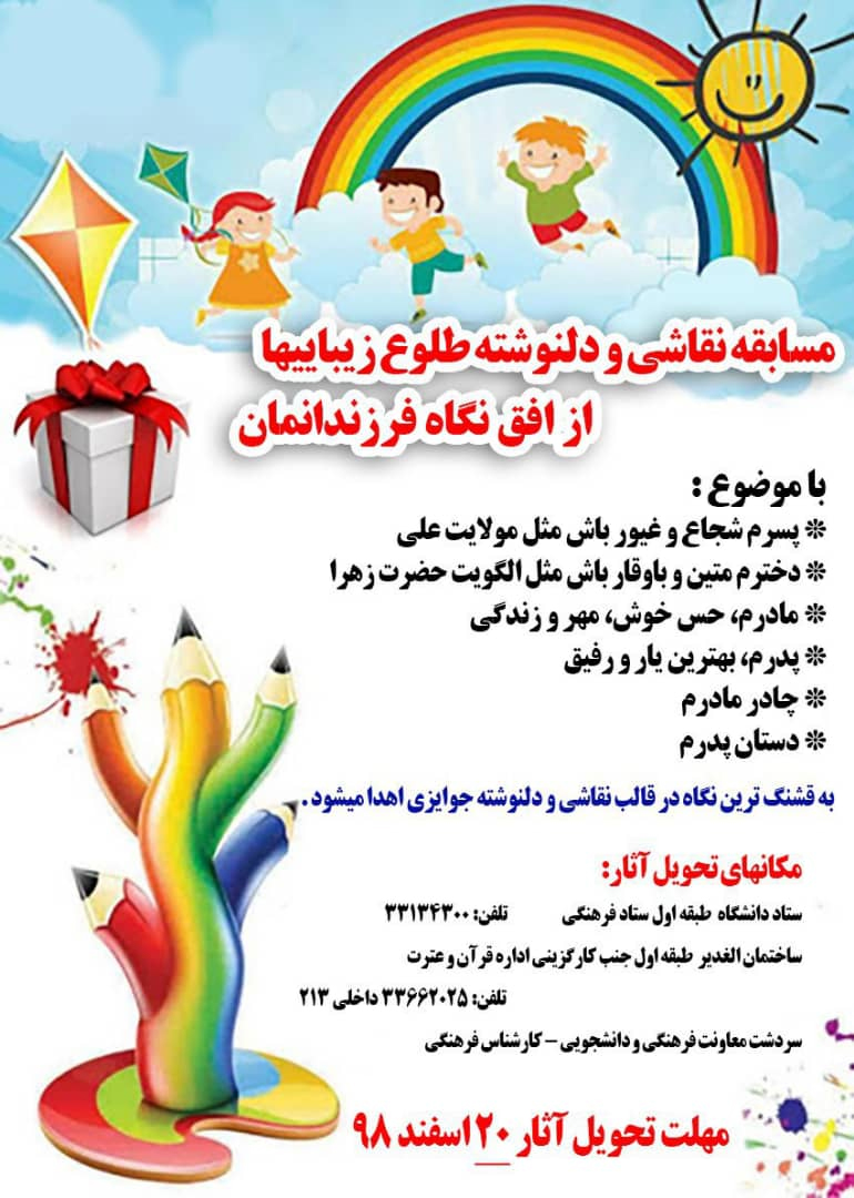 مسابقه نقاشی و دلنوشته طلوع زیبایی ها از افق نگاه فرزندانمان ۱۰ اسفند ۱۳۹۸ | ۰۹:۰۰ کد : ۷۸۷۰ اطلاعیه ارسال به دیگران نام شما ایمیل شما ایمیل دریافتکننده ارسال انصراف تعداد بازدید:۳۹۲۴۷
